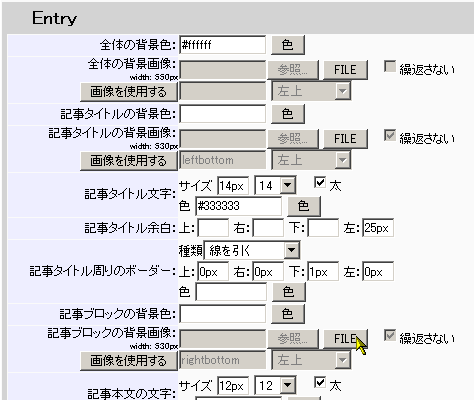 「Entry」と言うブロックにある「記事ブロックの背景画像」のところで「FILE」をクリックして、背景画像を指定します。